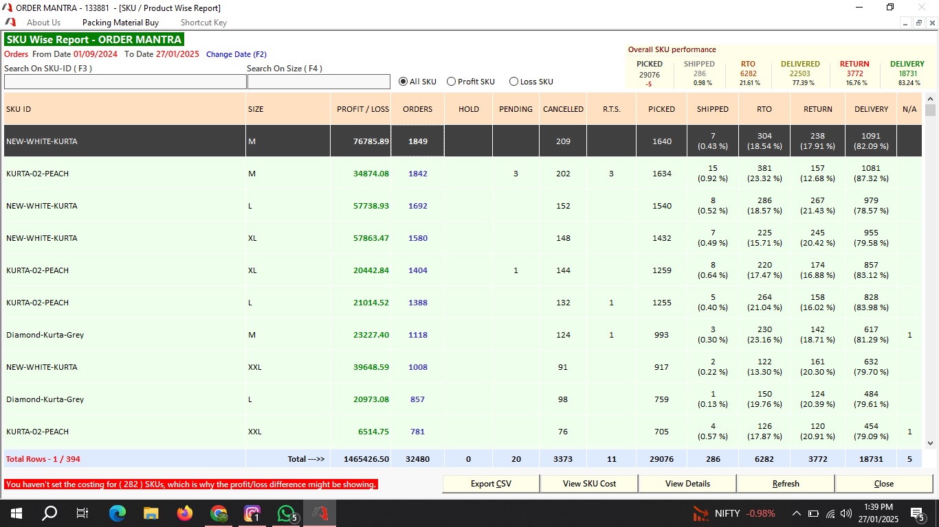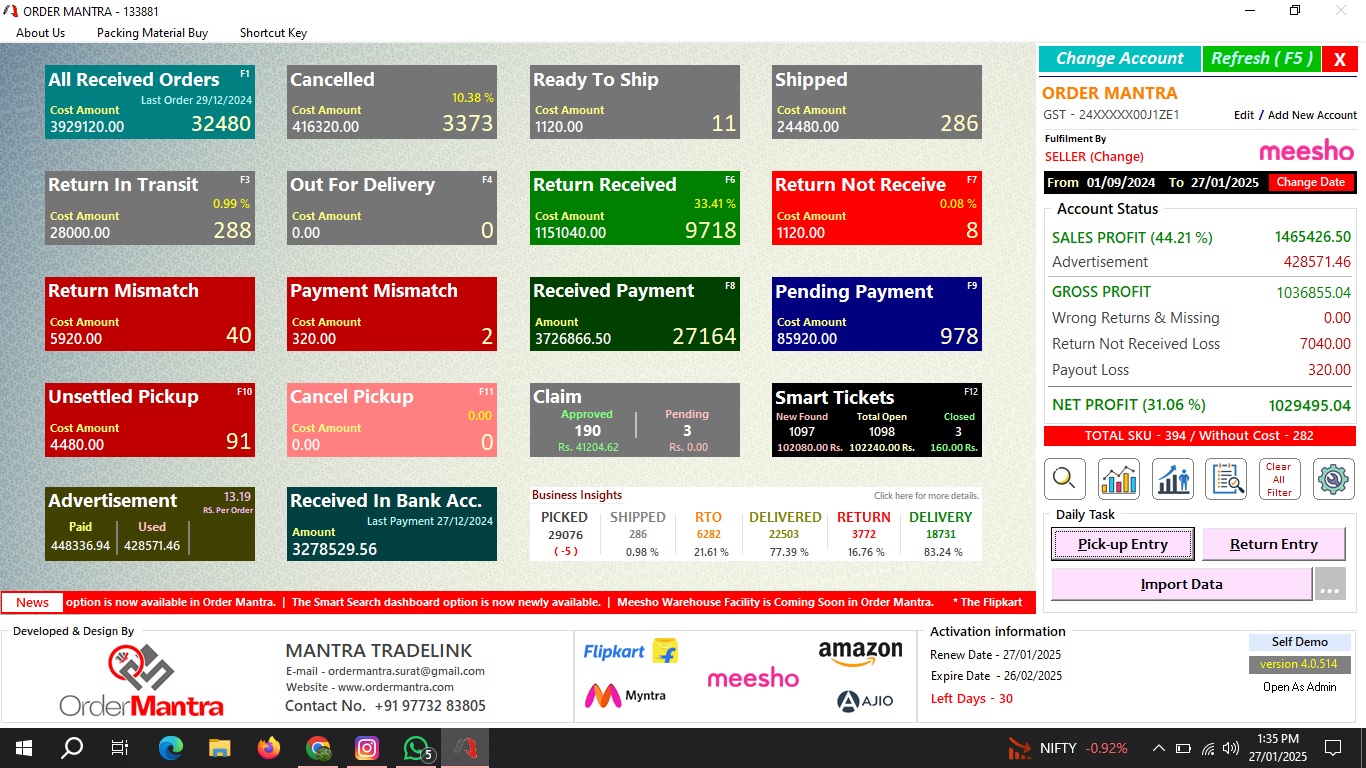 Order Mantra is a powerful desktop application specially designed for e-commerce sellers. Whether you’re selling on platforms like Meesho, Flipkart, Amazon, Ajio, or Myntra, our software helps you efficiently manage your orders, inventory, profits, losses, and returns.